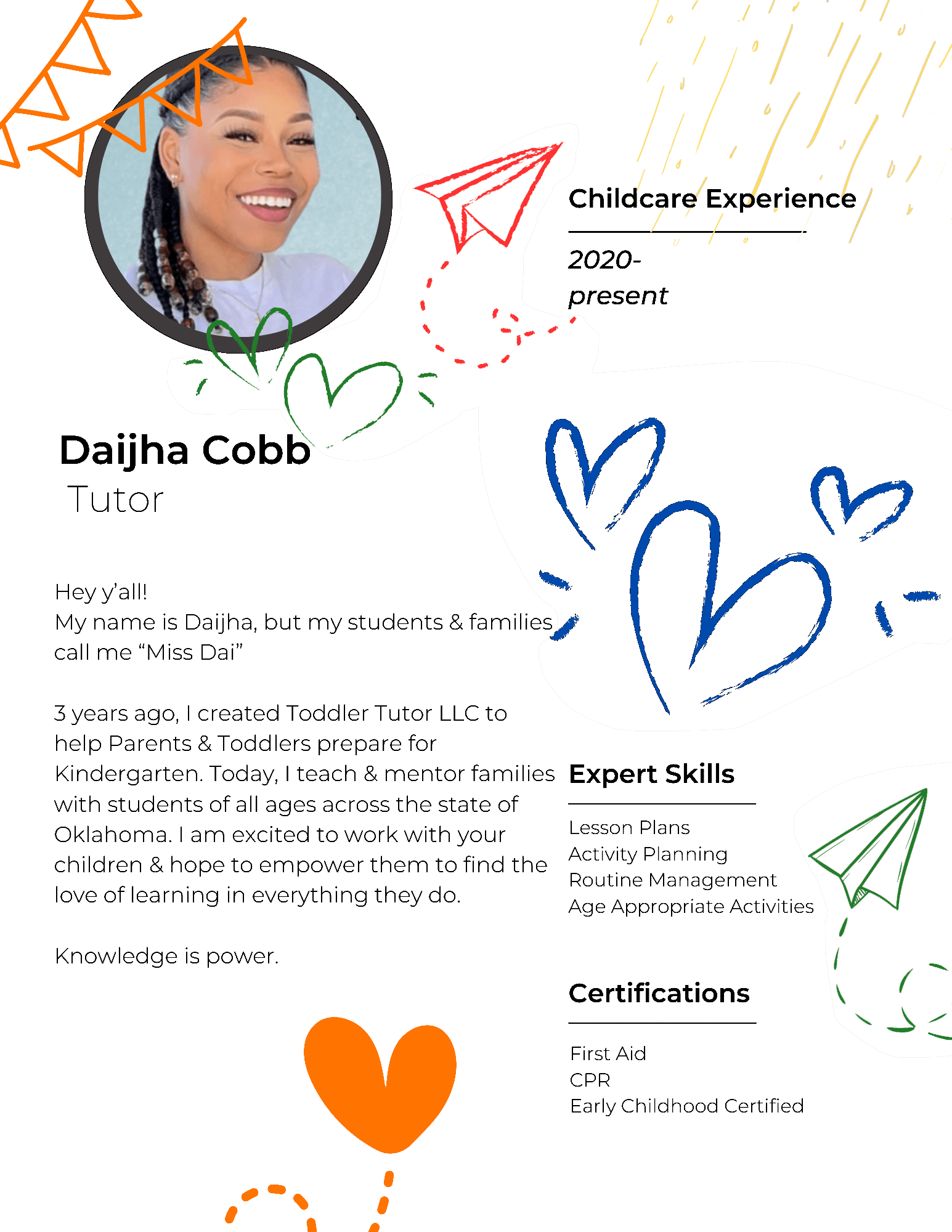 At Tiara Tiny Tots Childcare, our story and our work intertwine in a unique and heartfelt manner. Our foundational elements provide our bedrock to build from as well as the world we want to create for our children. We are an organization that believes in seeing and working toward a bigger picture at a high level. We also believe in being on the ground and in the action of “doing the work” of providing opportunities and showing success. Each person understands the needs, the direction, and the actions to empower every day. We envision a welcoming, inclusive, and strong holistic community in which all children reach their full potential without barriers.